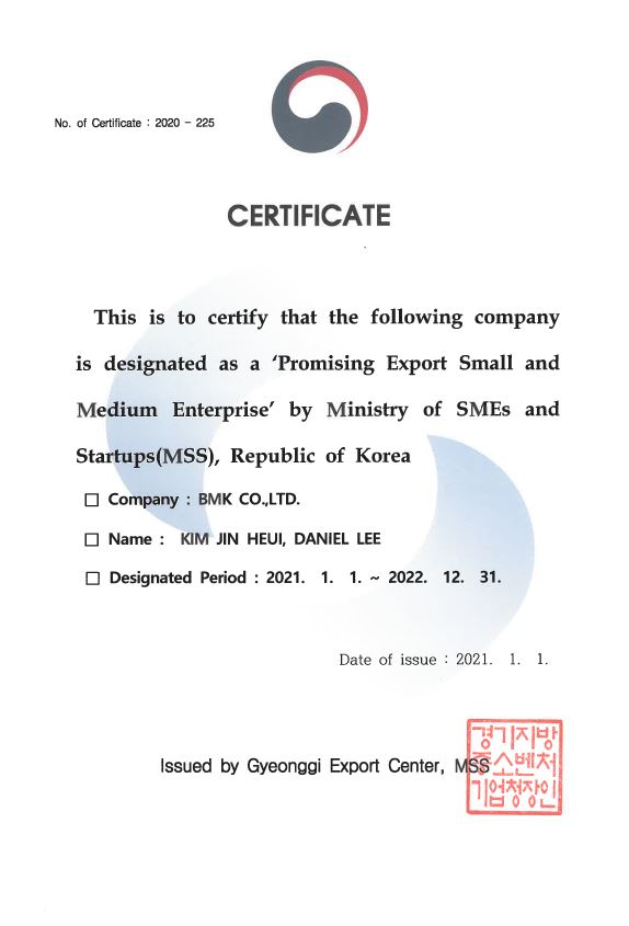 Promising Export Small and Medium Enterprise 페이지 정보 작성자 비엠케이 작성일21-01-22 10:56 조회2,134회 관련링크 이전글 다음글 목록 본문 'Promising Export Small and Medium Enterprise' by Ministry of SMEs and Startups(MSS), Republic of Korea 이전글 다음글 목록